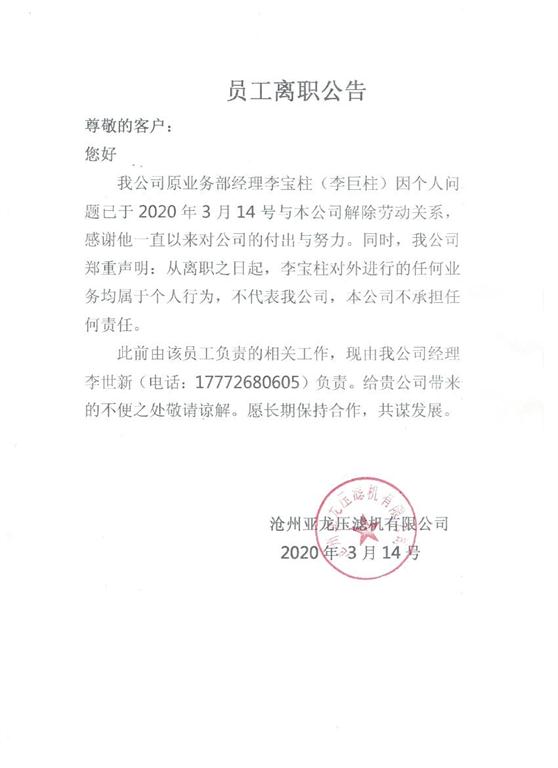 業務部經理離職聲明